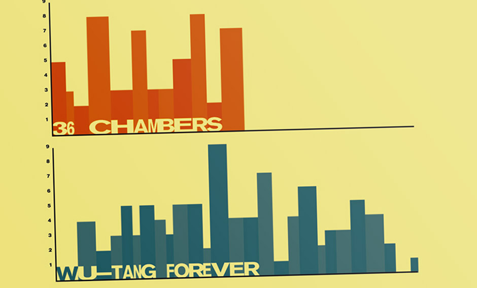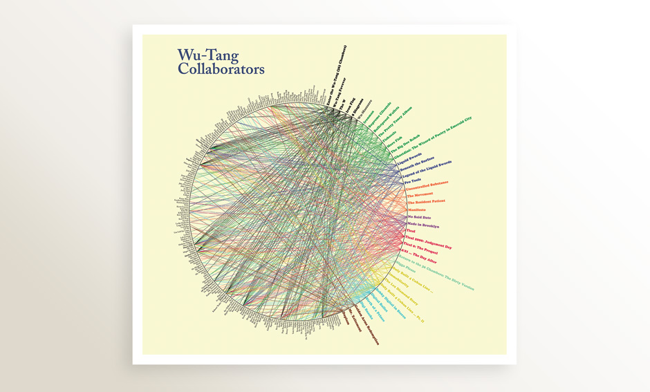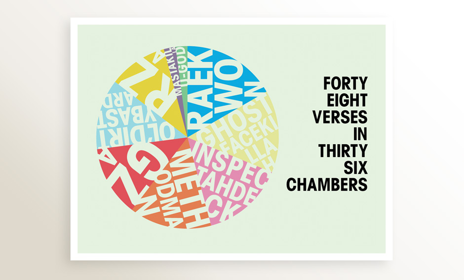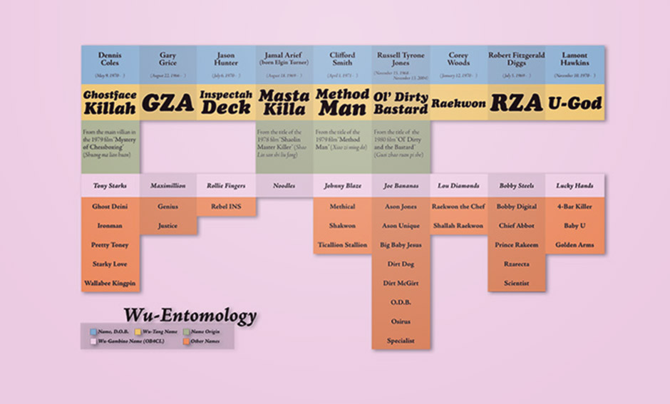The Wu Tang sword style, juxtaposed with pastel infographics. This series of infographics were created in 2010 with an attempt to take Wu Tang Clan information and extrapolate it into as many diffent types of charts as possible.